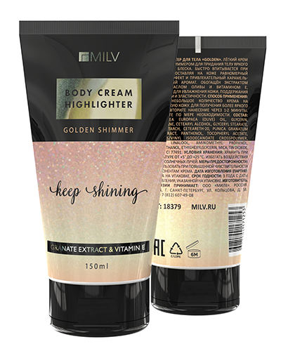 Лёгкий крем с золотым шиммером для придания телу яркого мерцающего блеска. Быстро впитывается при нанесении, оставляя на коже равномерный сияющий эффект и привлекательный карамельно-фруктовый аромат. Обогащён экстрактом граната, маслом оливы и витамином Е, эффективен для увлажнения кожи, поддержания её гладкости и эластичности.